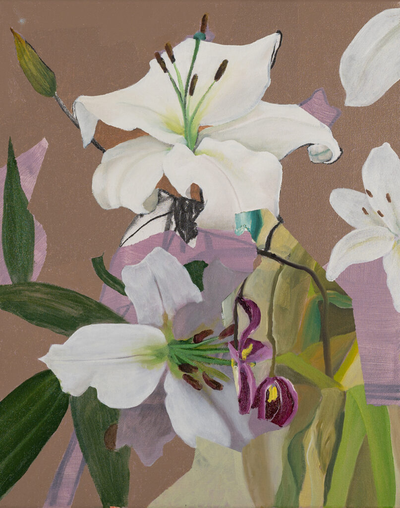 Lelies en tulpen2023Houtskool, acryl en olie op doek40×50